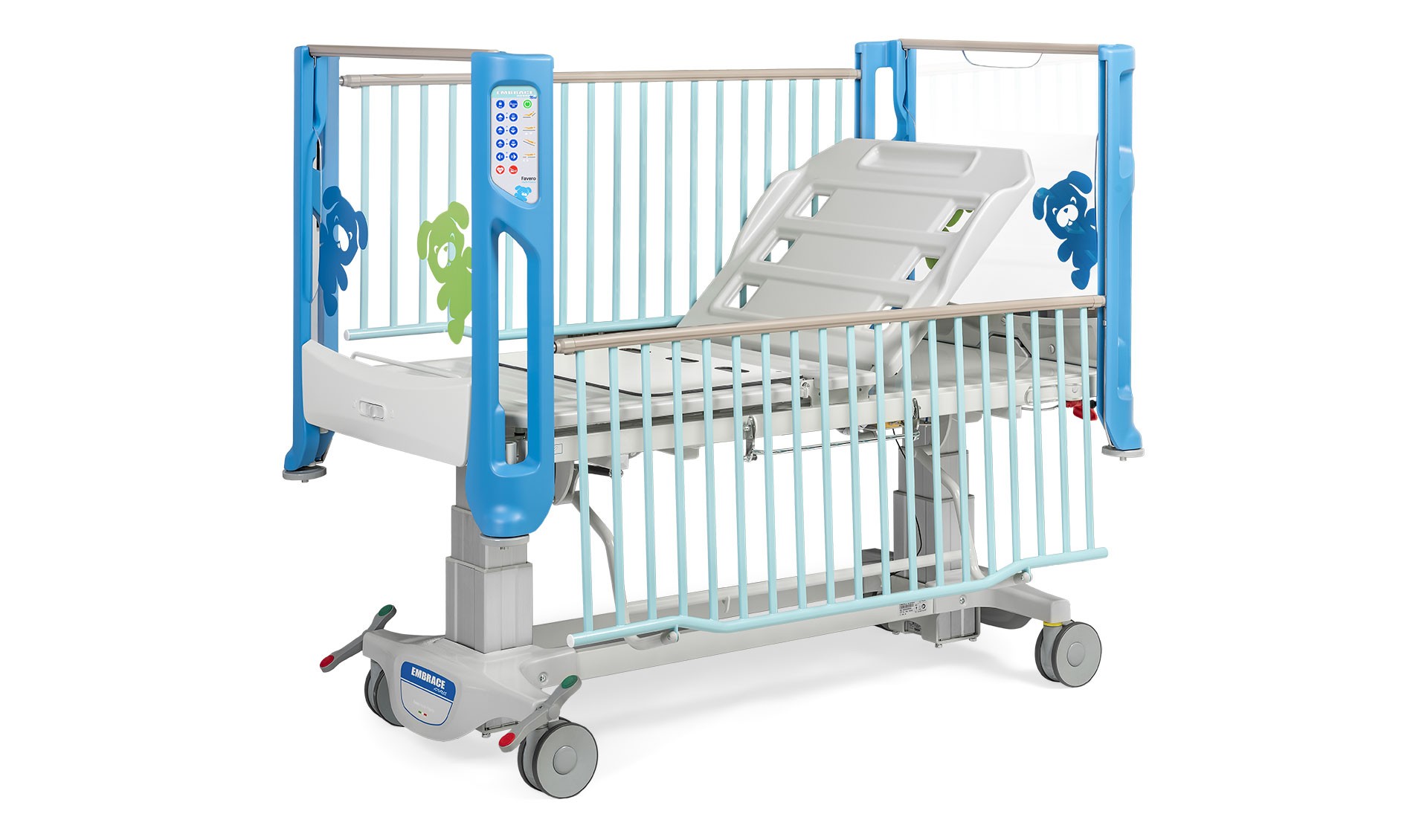 A cama Embrace Advance Next, da Favero Health Projects, estende-se eletricamente para se adaptar a crianças de todos os tamanhos. As posições elétricas de Trendelenburg e Reverse Trendelenburg oferecem grande flexibilidade no posicionamento e cuidado do paciente.