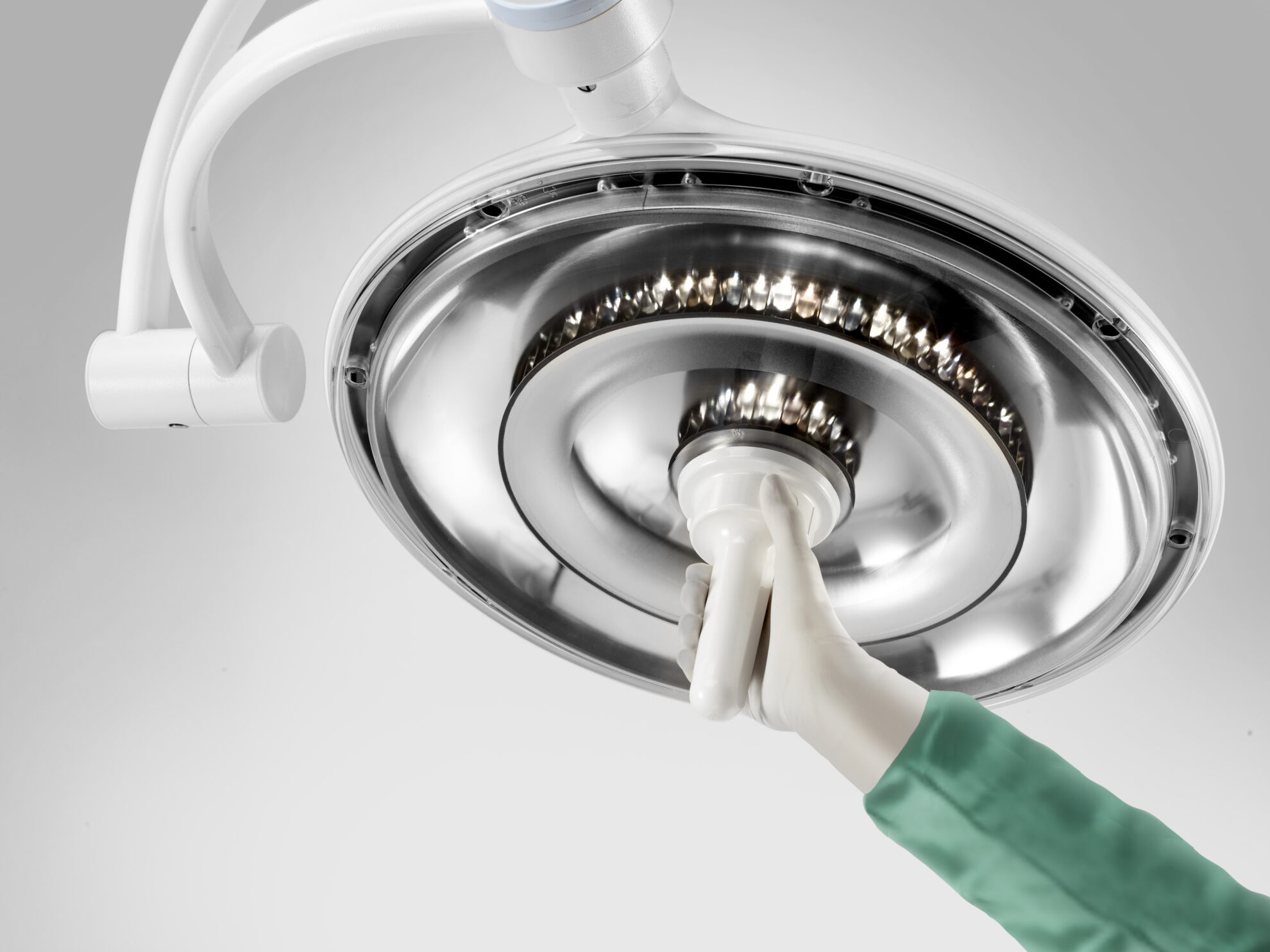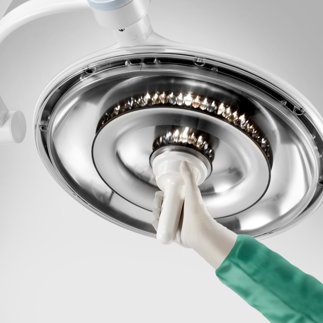 O punho esterilizável com sensores capacitivos permite ajuste de intensidade, temperatura de cor e modo de iluminação, tudo sem sair do campo estéril. Alternativamente, o teclado capacitivo da cúpula pode ser utilizado para ajustes rápidos.